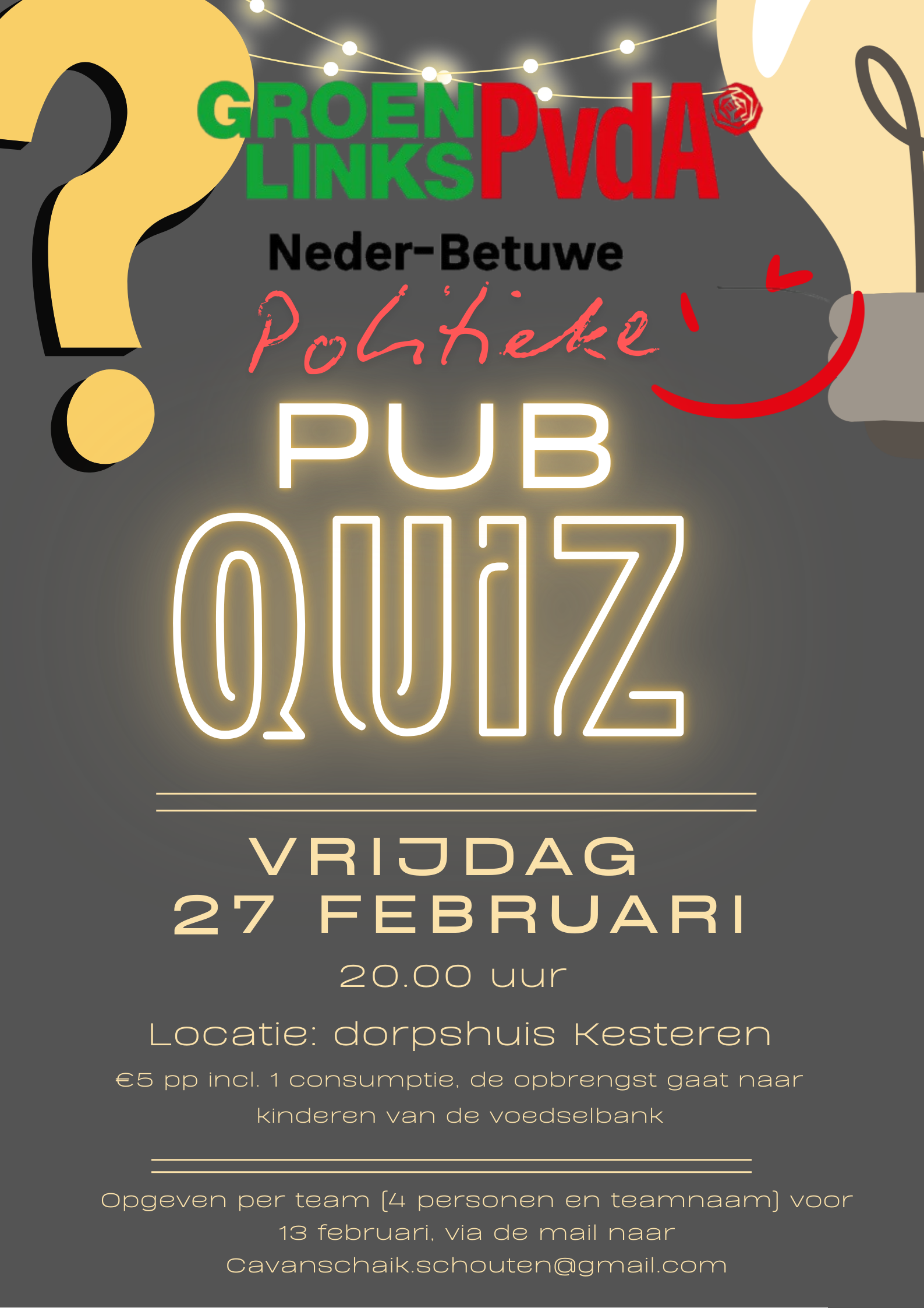 op vrijdag 27 februari 2026 organiseert GroenLinks PvdA Neder-Betuwe een Politieke PubQuiz met een ;)